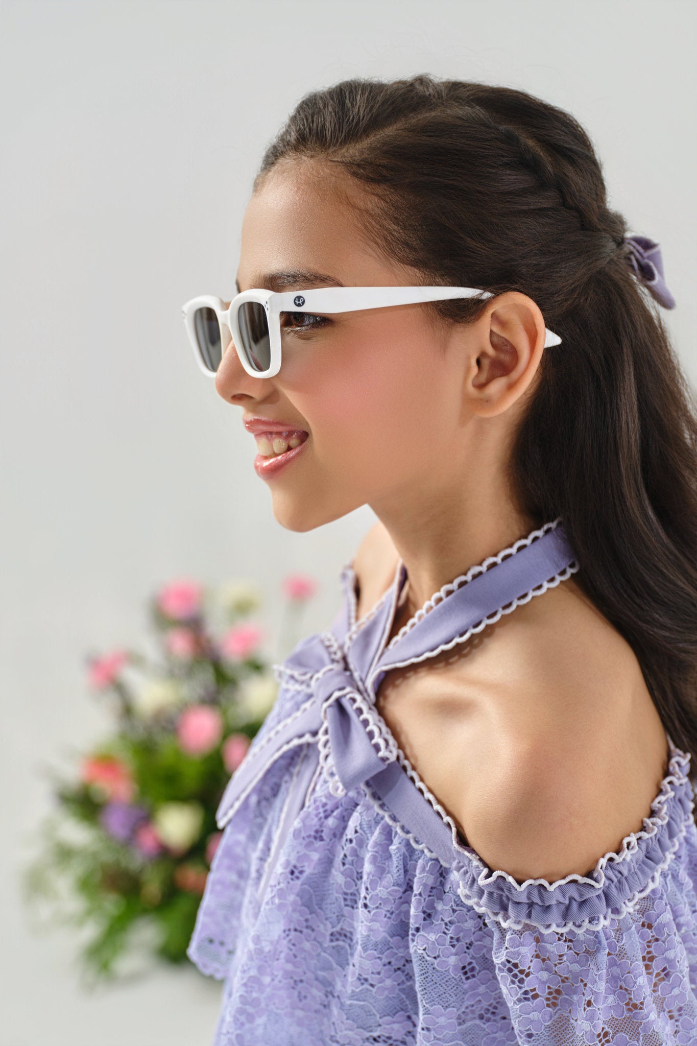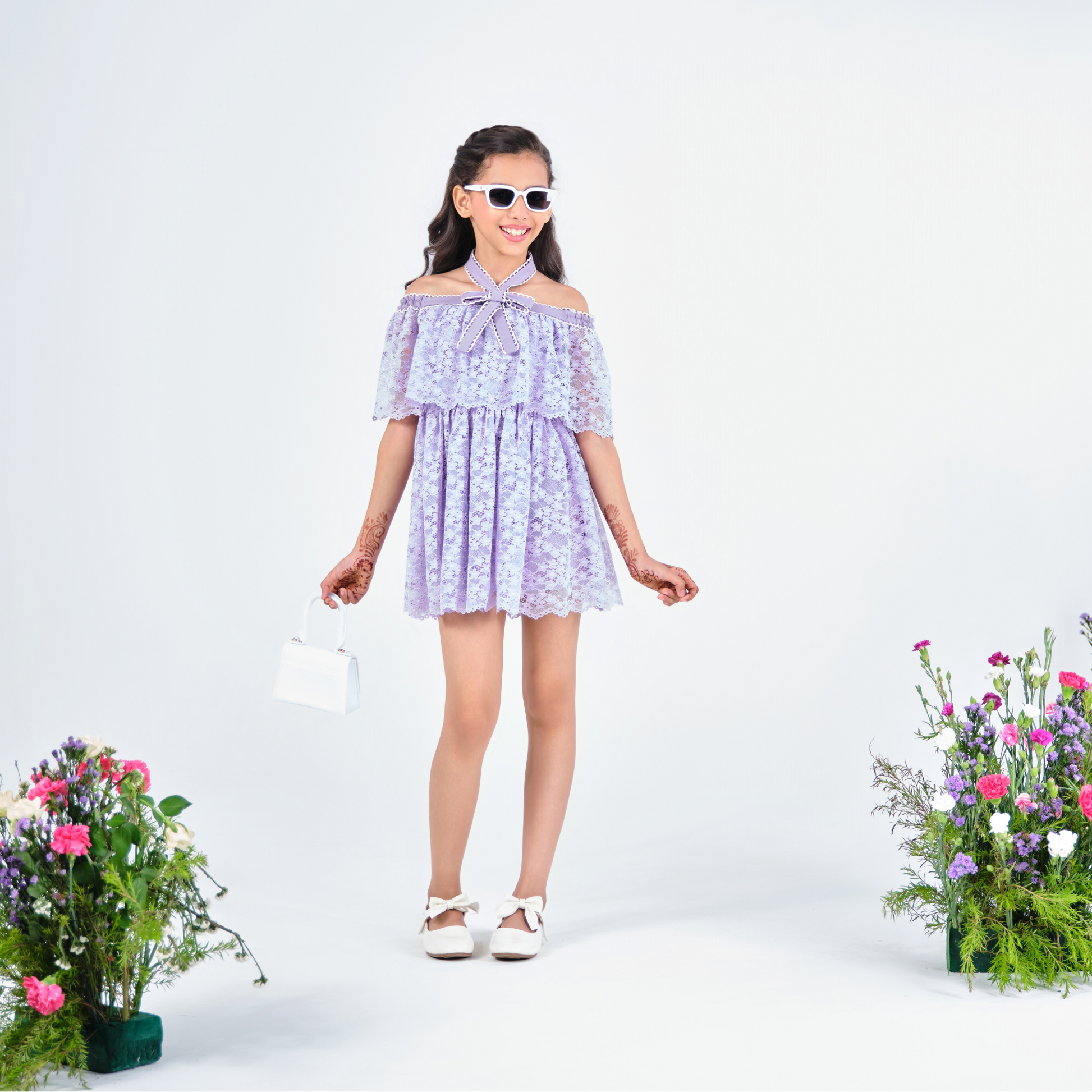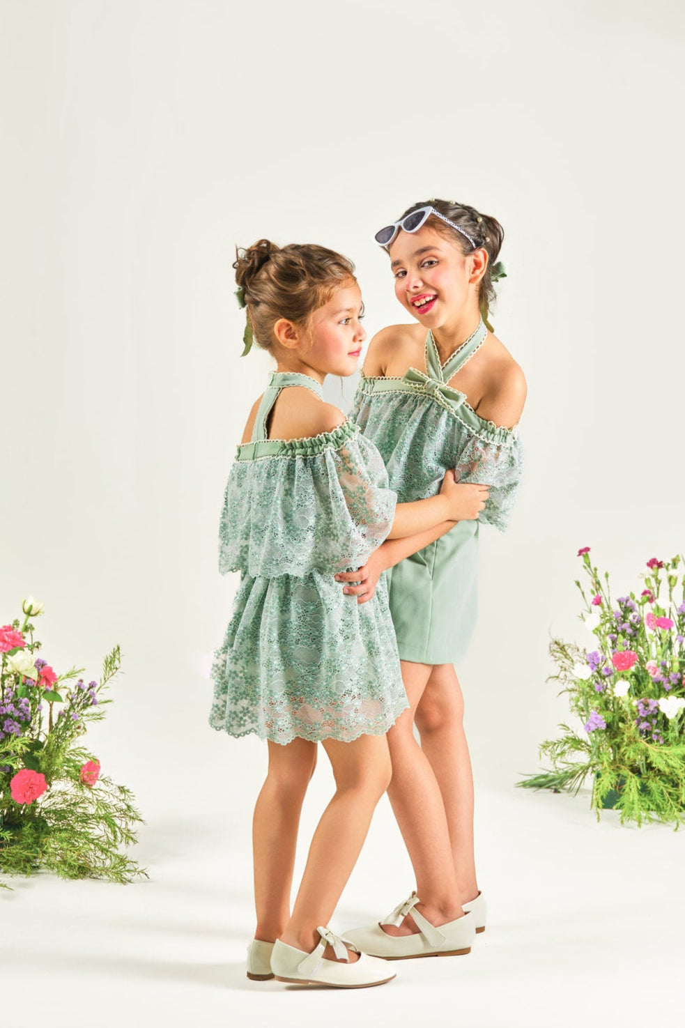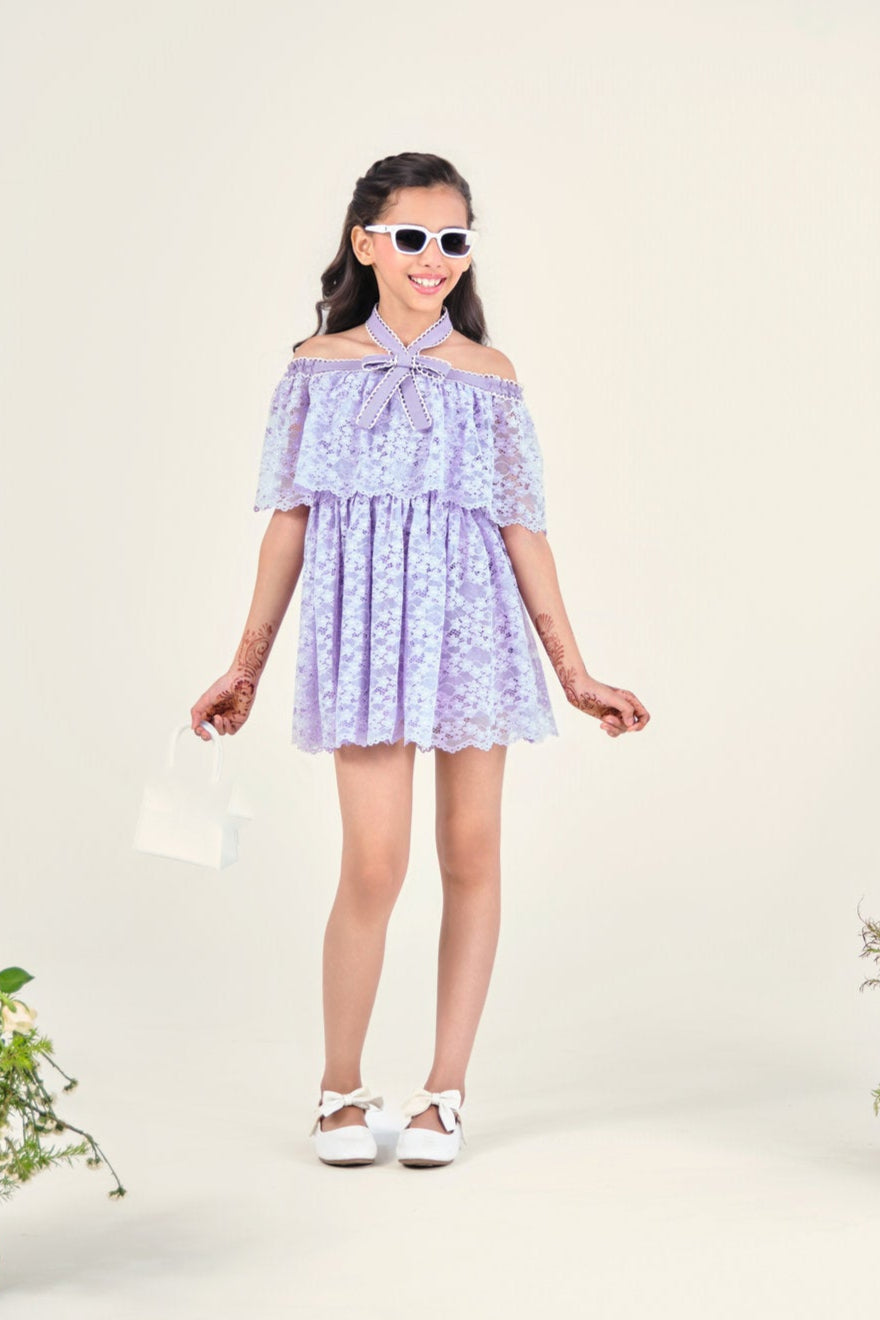 Rendered in fluid Serenity Stretch Charmeuse with tiers of Chantilly net cord‑lace over a smooth crepe lining, this halter‑neck dress dances with every step. A petite bow-cut from the same fabric, sits at the center neck, while scalloped lace trims the hem for an extra touch of dainty detail. Airy, effortless, and endlessly playful, it’s made for summer picnics, birthday celebrations, or any spirited day of fun.