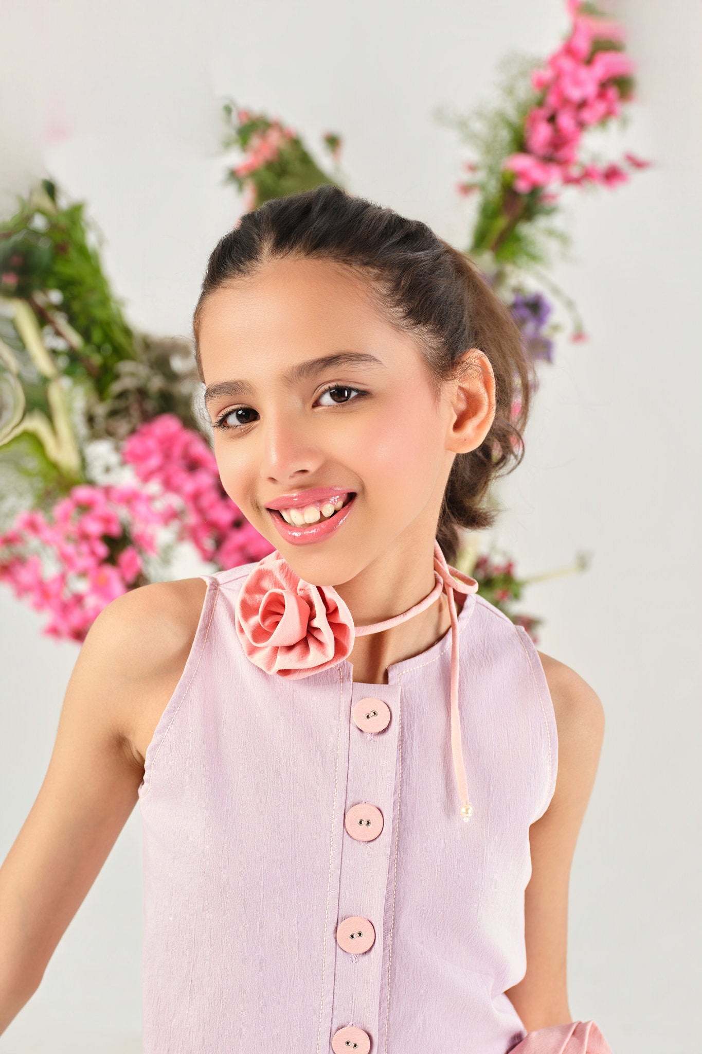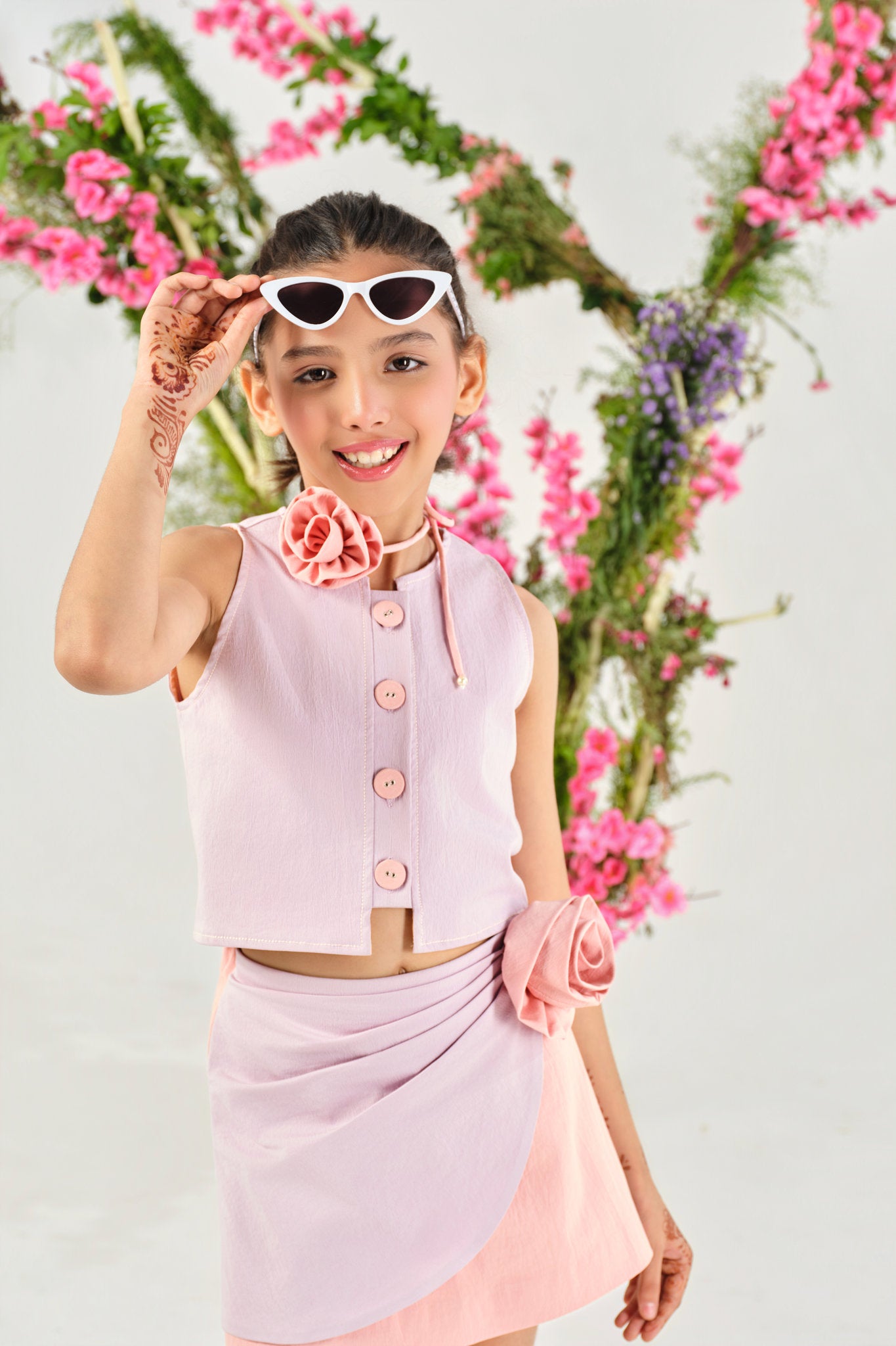 Chic, cheerful, and charming — our Rosette Radiance Co-ord Set is designed for the little fashionista who loves to stand out! This elegant two-piece set in soft shades of blush and peach features a sleeveless front-buttoned top paired with a stylish asymmetrical skort. The standout detail? Beautiful velvet rosettes – one at the neck and another at the waist – adding a dreamy floral flair that’s perfect for special occasions or stylish everyday wear.
