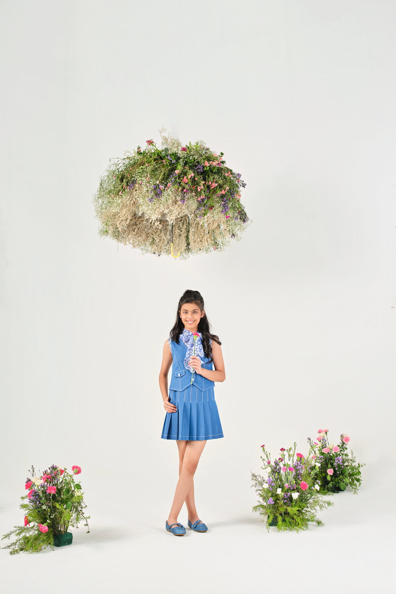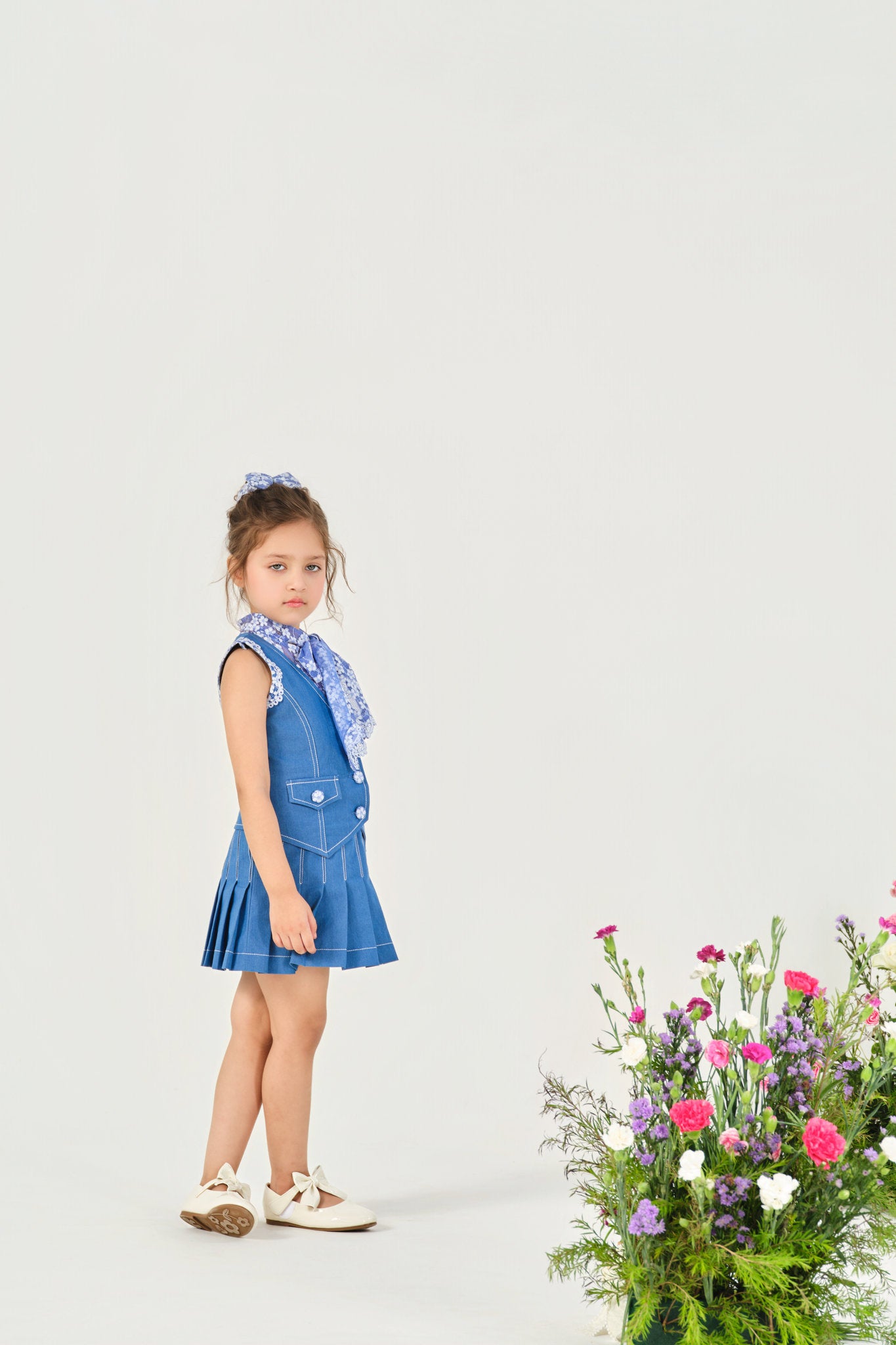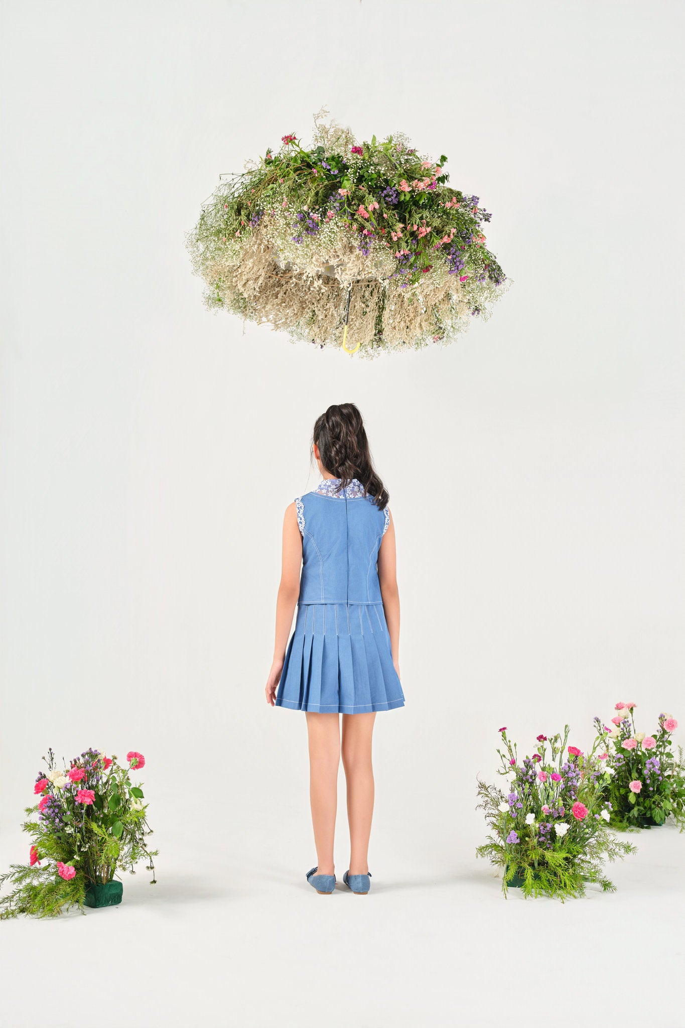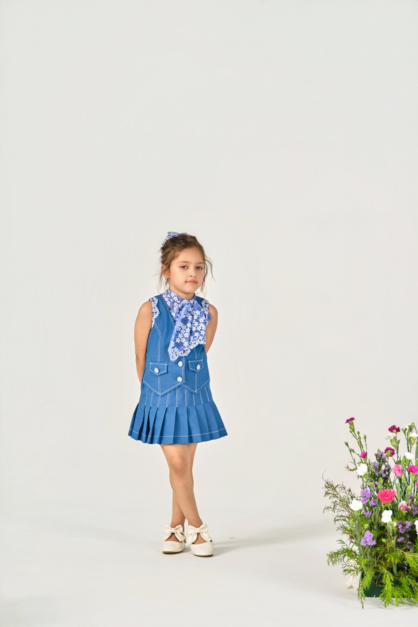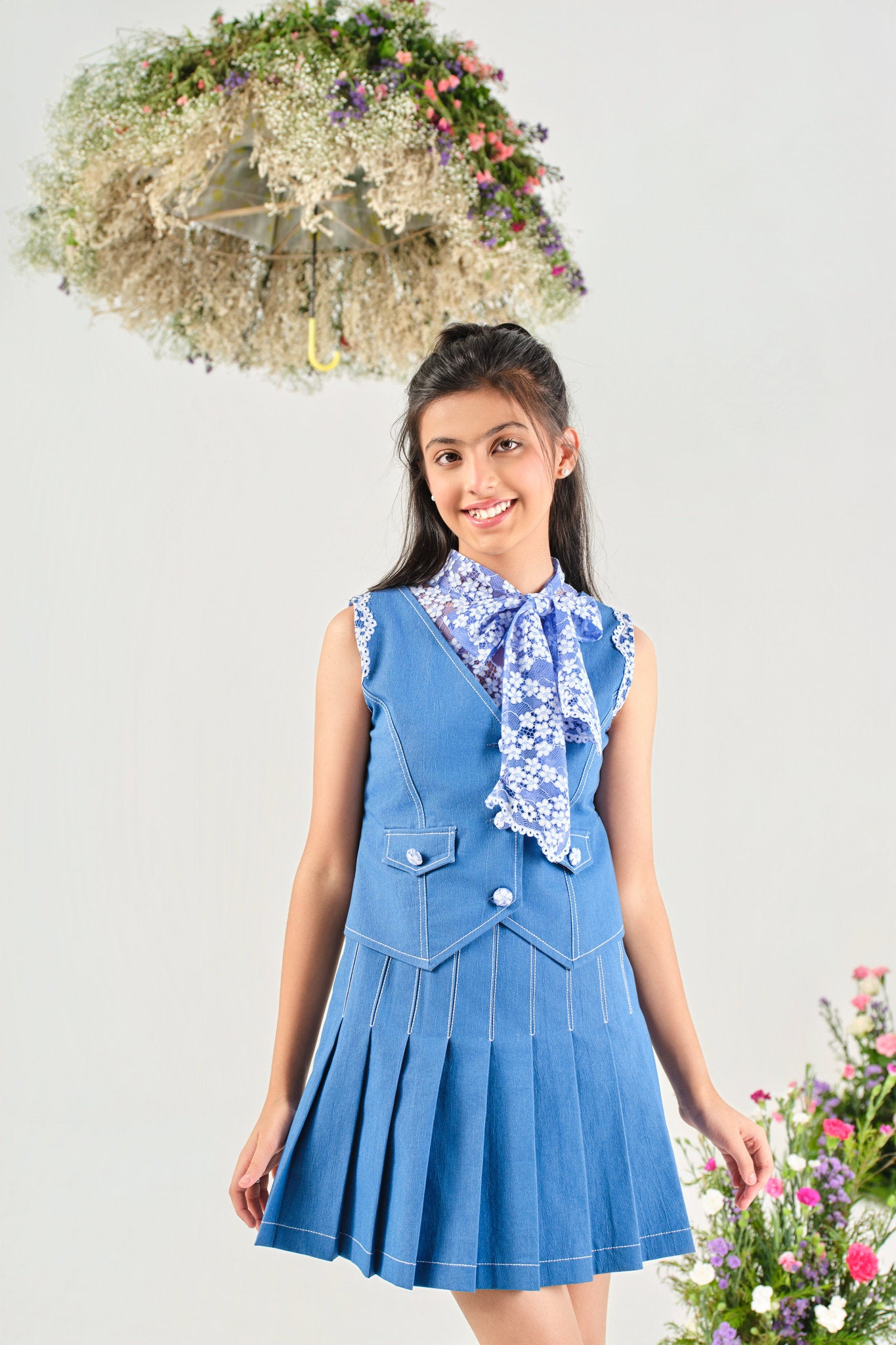 Denim Co-ord Set with Chantilly Lace Bow & Pleated Skirt