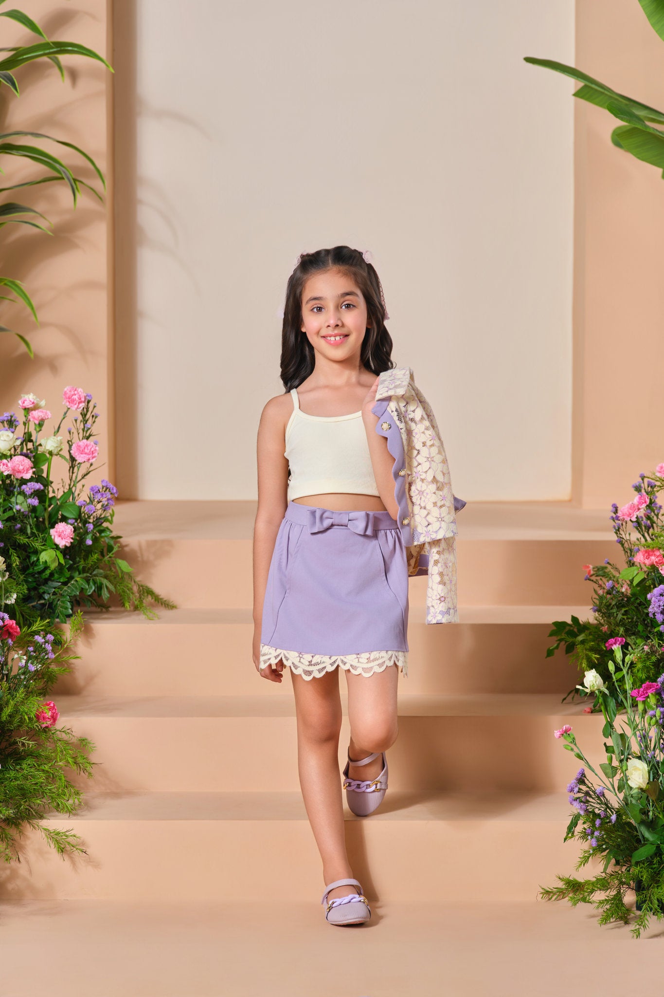 Skirt: High-waisted lilac skirt with a built-in belt, side pockets, and elegant scalloped lace hem