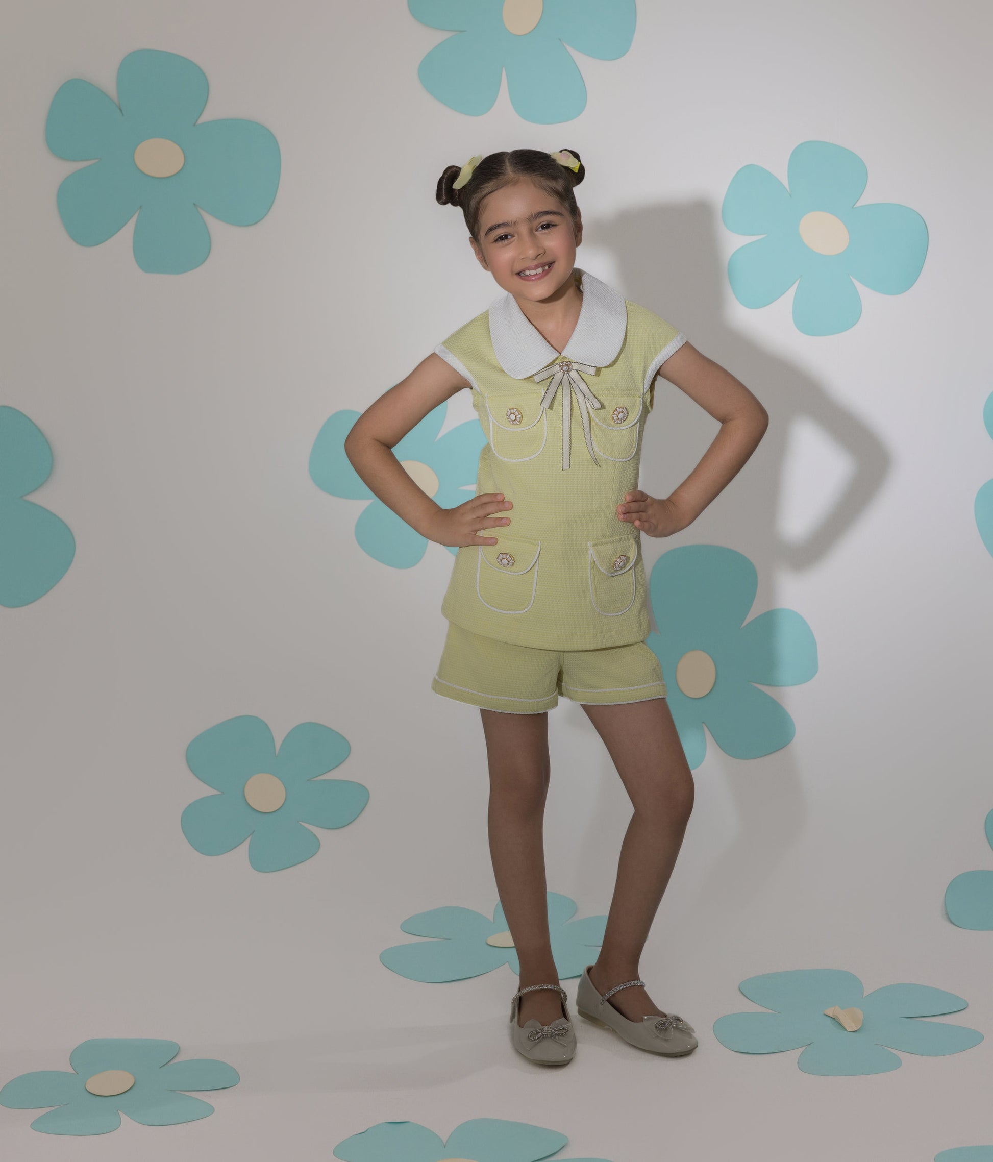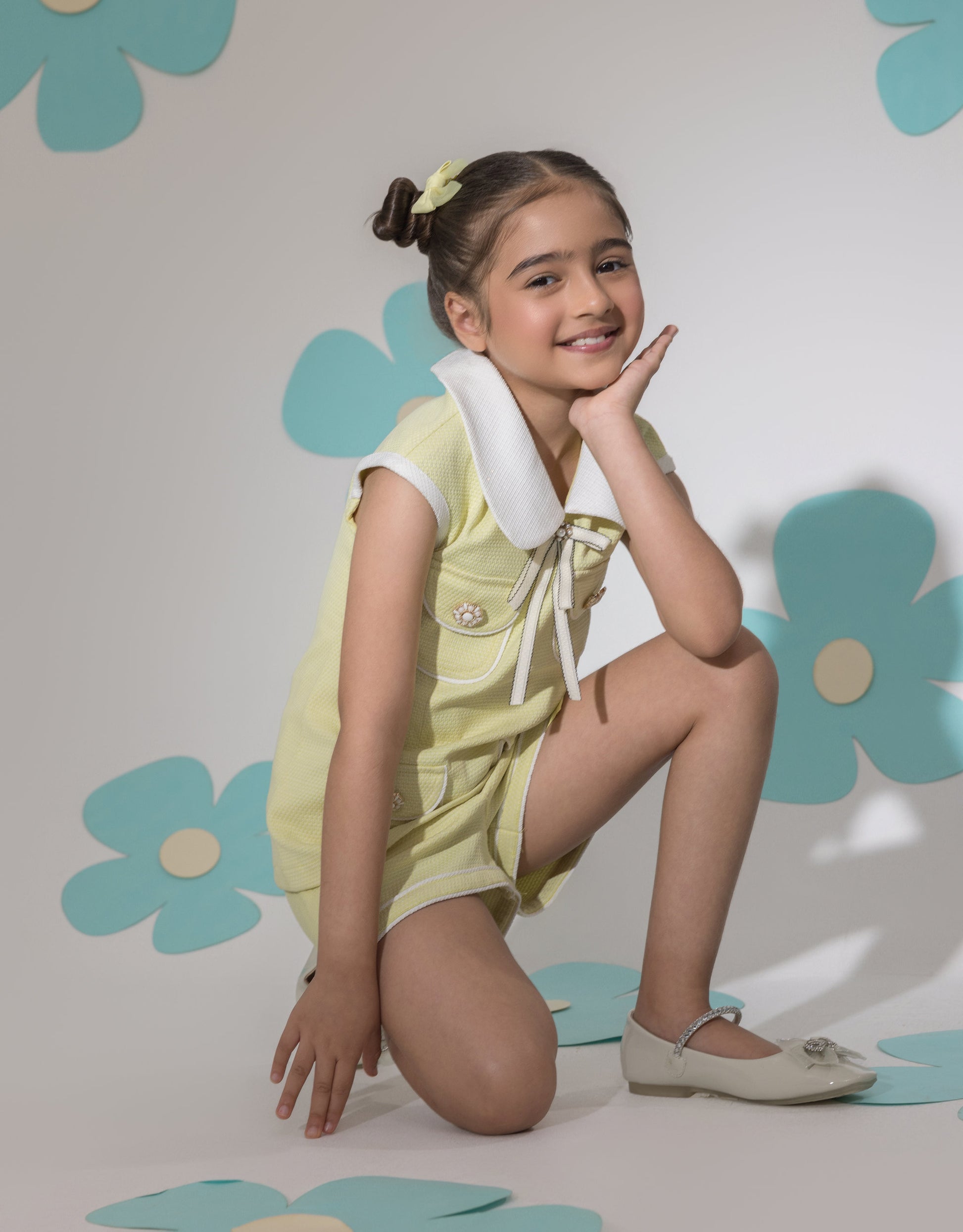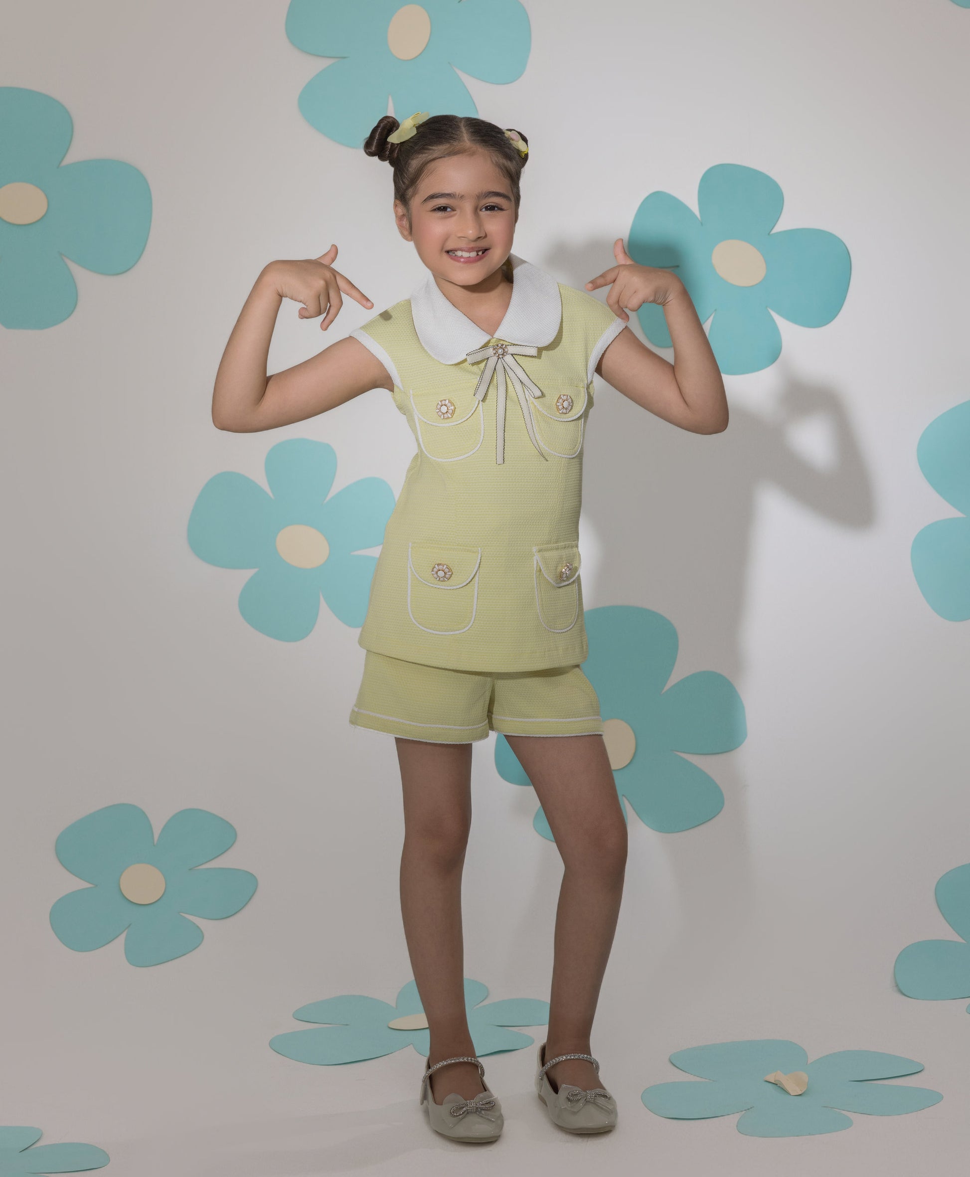 This adorable retro-inspired co-ord set is perfect for a playful, yet polished look. The outfit features a soft pastel yellow cap sleeve top with a classic Peter Pan collar in white, adding a touch of vintage charm. The top is adorned with cute buttoned pockets, detailed with floral shapes embellished buttons, which bring a hint of whimsy to the design. A delicate ribbon tie at the collar adds a sweet, feminine touch. Paired with matching high-waisted shorts, the ensemble creates a balanced and breezy feel. This set is ideal for warm days, combining style and comfort in a chic, nostalgic vibe!