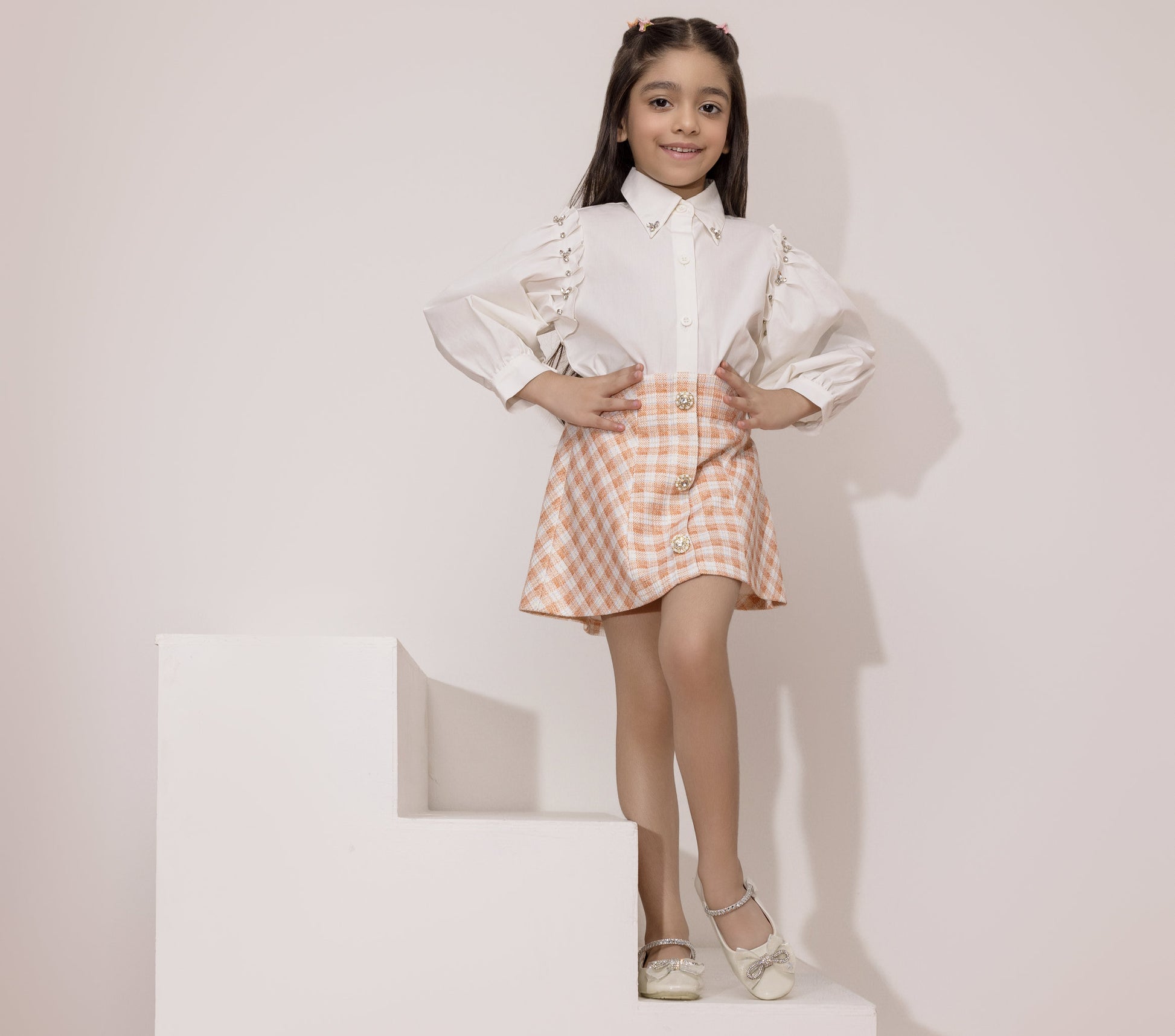 Delight in the beauty of simplicity with this enchanting outfit. The pristine white cotton shirt showcases uniquely designed pleated stone work embellished armhole sleeves and collar, complemented by voluminous pleated cuffs. This is beautifully paired with a vibrant orange checkered panelled skirt that features built-in shorts for ease adorned with delightful button details. Together, these elements create a striking contrast that exudes charm and sophistication-a perfect embodiment of timeless grace.