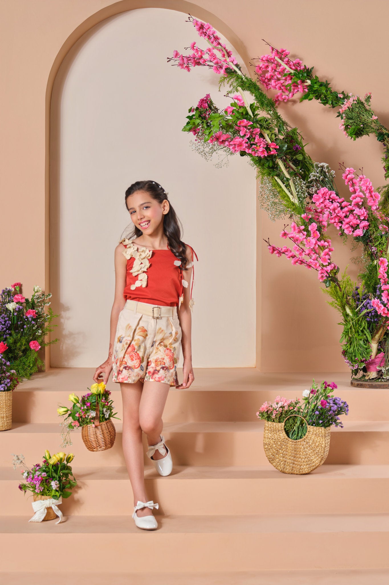 Set Includes: Asymmetric rust-orange top and floral high-waisted shorts