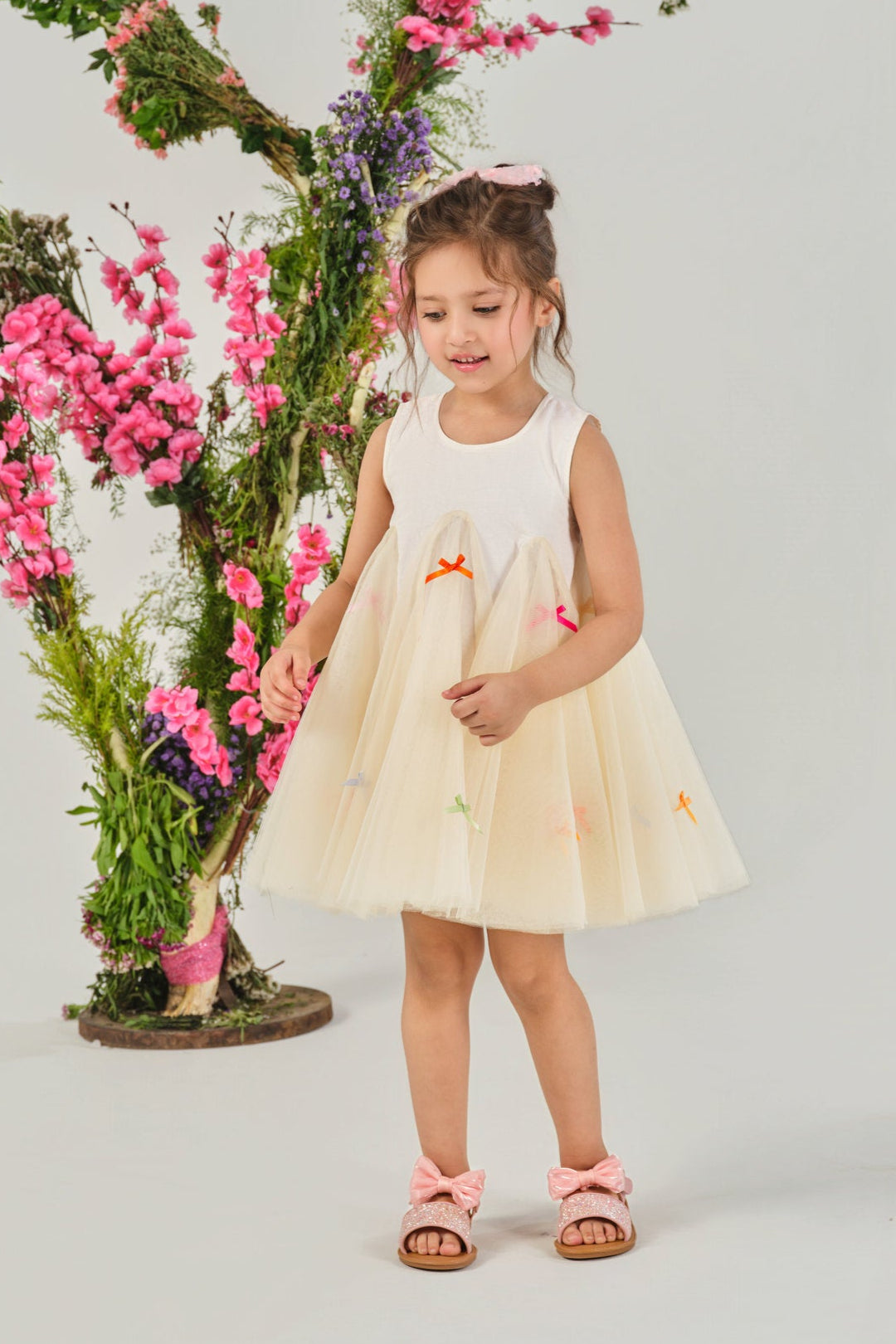 Let your little one twirl into a fairytale with the Whimsy Bows Tulle Dress—a dreamy blend of playfulness and grace. Featuring a soft sleeveless cotton bodice and a voluminous cream tulle skirt, this dress is adorned with multicolored miniature bows for a pop of vibrant charm. The silhouette is light, airy, and made for movement—perfect for birthdays, garden parties, or just dancing in the sunshine.