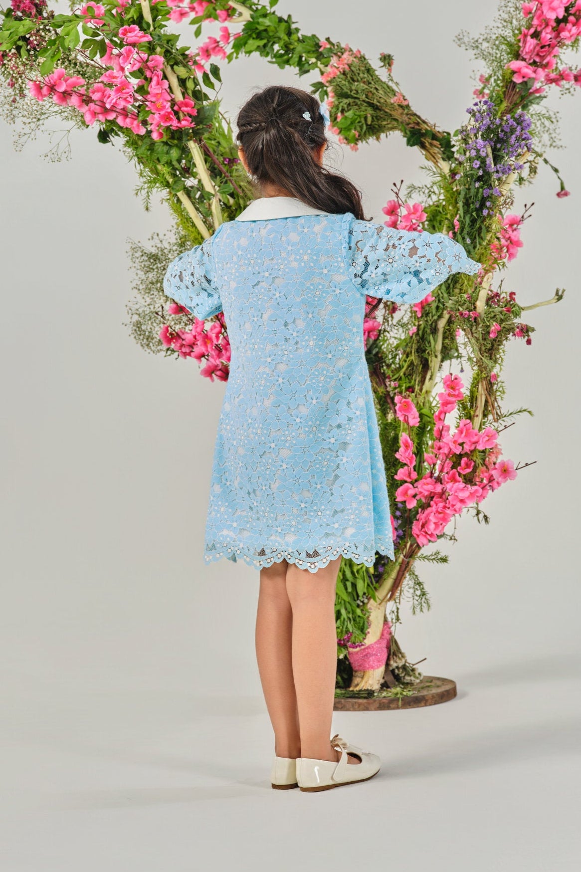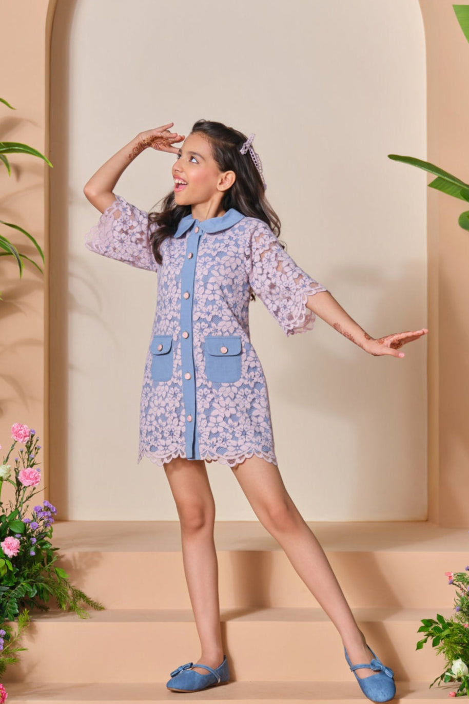 Where vintage meets versatility, this midi-length trench dress is cut in CloudFlex Denim and layered with Chantilly cord-lace, combining structure with delicate texture. Featuring a curved denim collar, flap pockets, and lace-trimmed sleeves, this piece blends utility with softness. A center placket of denim breaks the floral pattern just right, while a cotton voile lining ensures breathable ease. Ideal for brunch outings or special celebrations, this is floral tailoring at its finest.