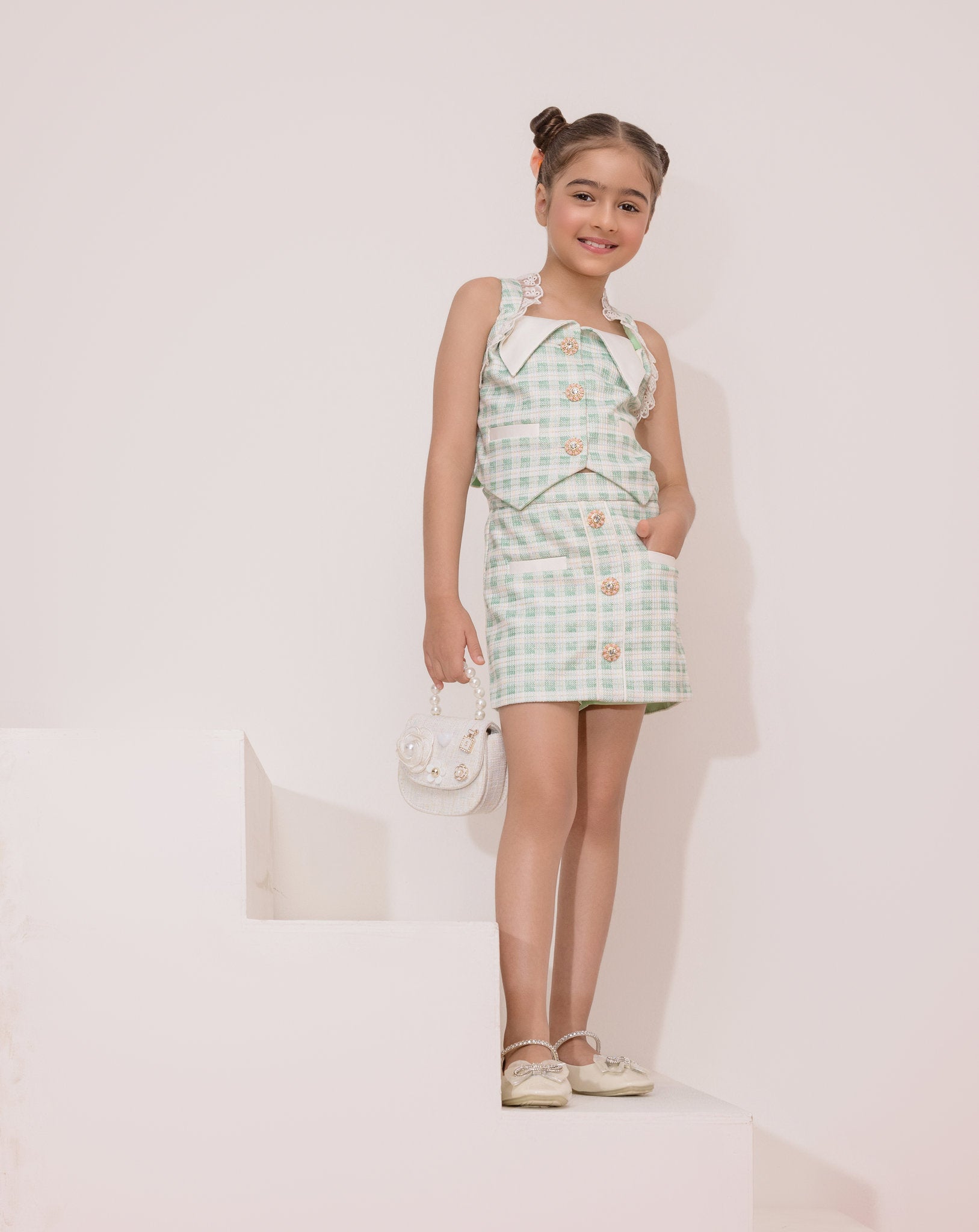 Made in a check patterned fabric in tone of green, this co-ord set beautifully balances youthful charm with refined elegance. This vest top featuring pop button closure and lace detailing at the armhole adding a touch of sophistication.