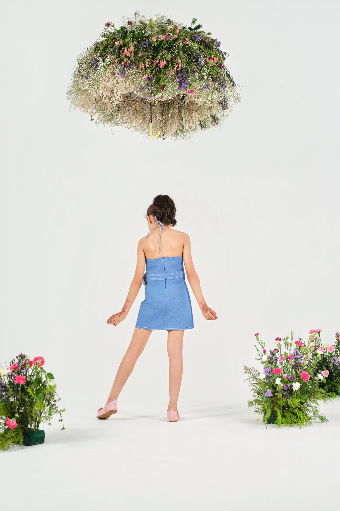 Add a dose of whimsy and charm to your little one’s wardrobe with our Rosette Ruffle Denim Dress. This halter-neck mini dress features a stylish asymmetrical cut, accentuated with two beautifully crafted denim rosettes—one at the shoulder and another at the waist. A soft cascading ruffle adds movement and elegance, making it perfect for playful occasions or special events.