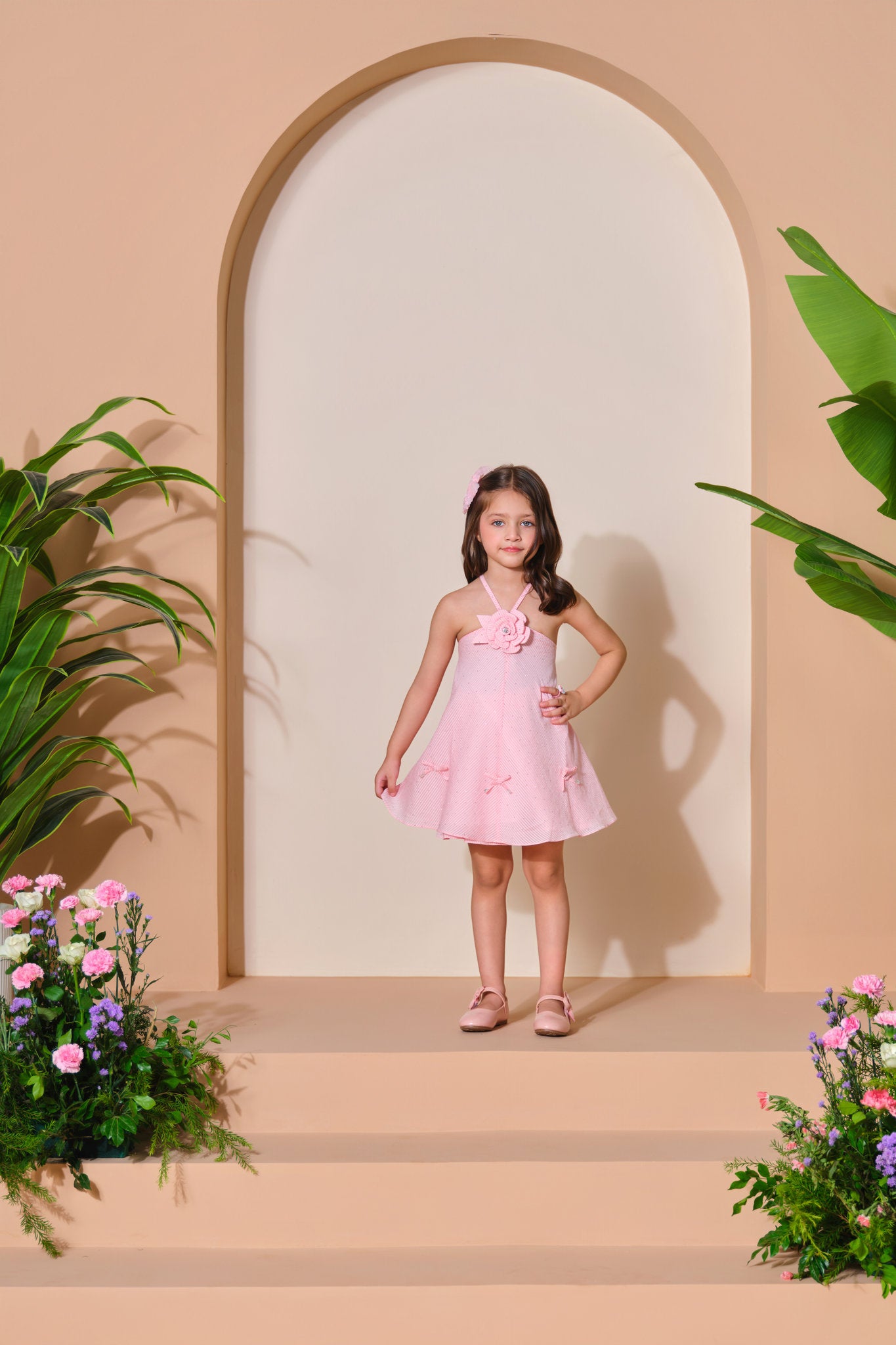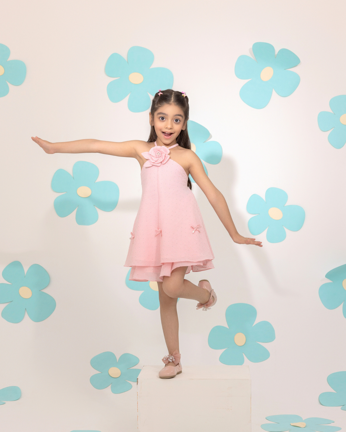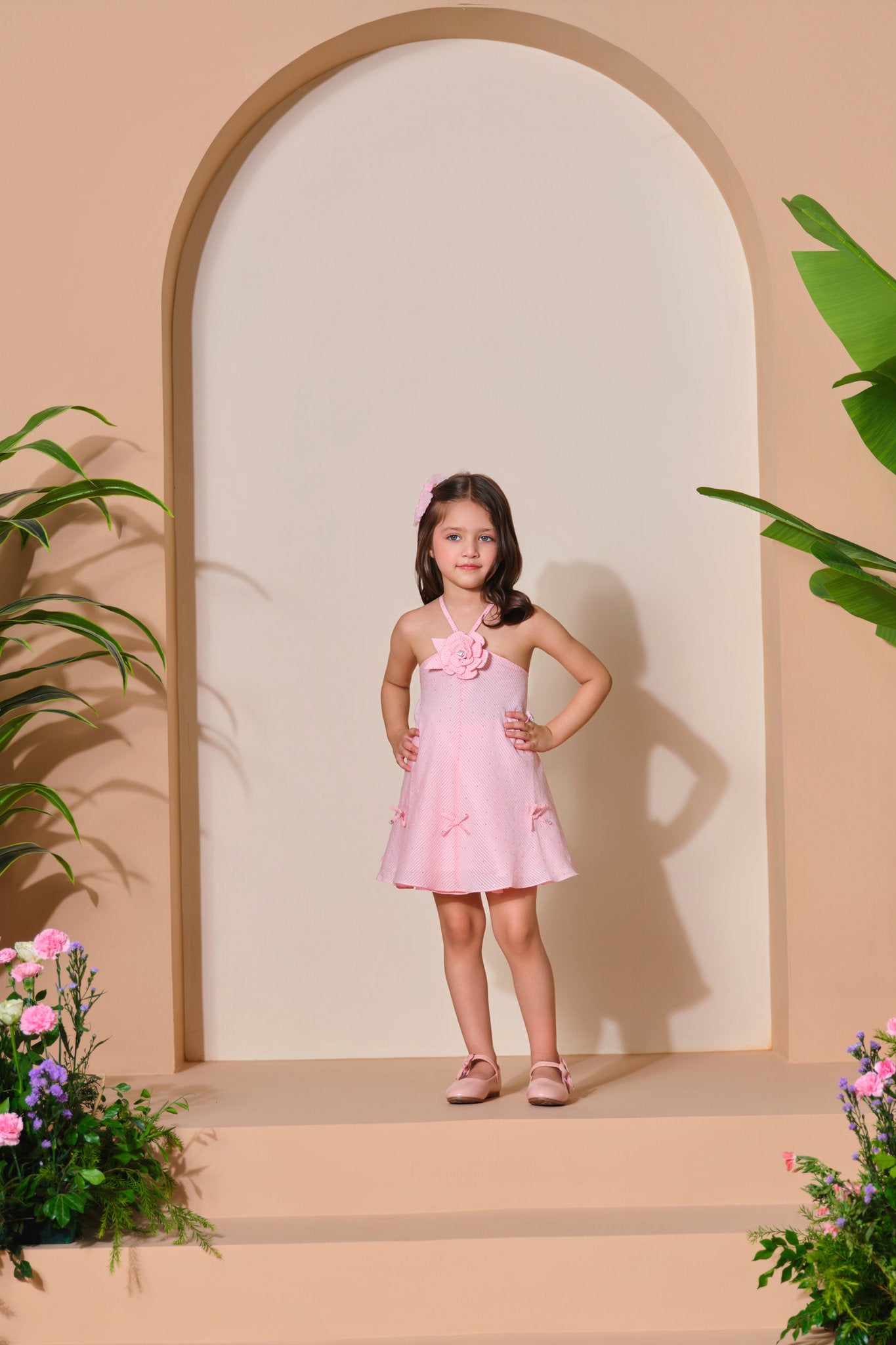 A 2 pc set includes layered pink halter neck dress with a frilly shorts comes with pocket details is a delightful addition to any little girl's wardrobe, crafted from striped fabric. Its big rose embellishment on the neck not only enhances its femininity but also ensures comfort, making it ideal for warm weather and special occasions. This versatile piece is perfect for birthday parties, family gatherings, or casual outings, with its eye-catching pink color and delicate bow details adding a soft, classy touch that stands out beautifully in any occasion.