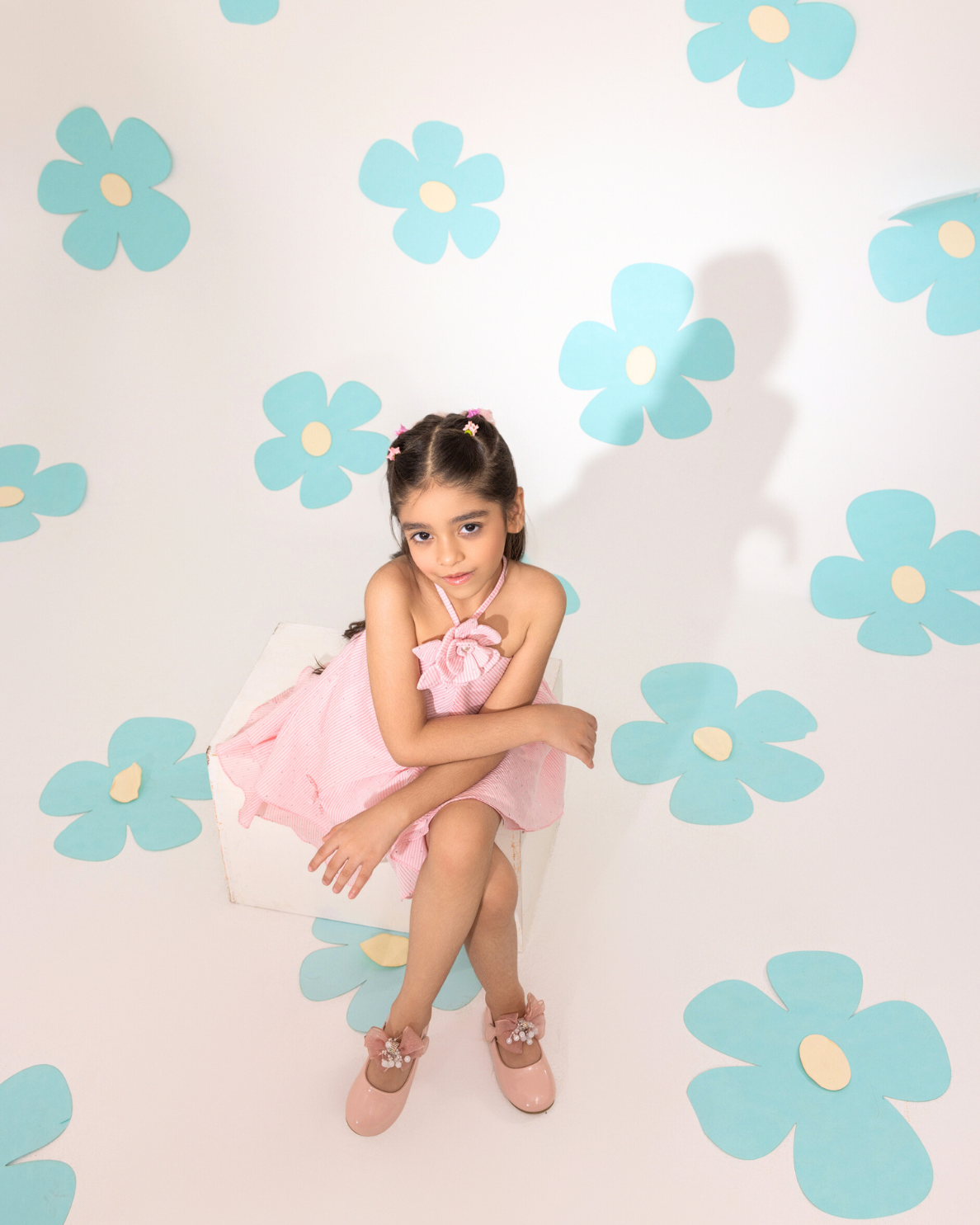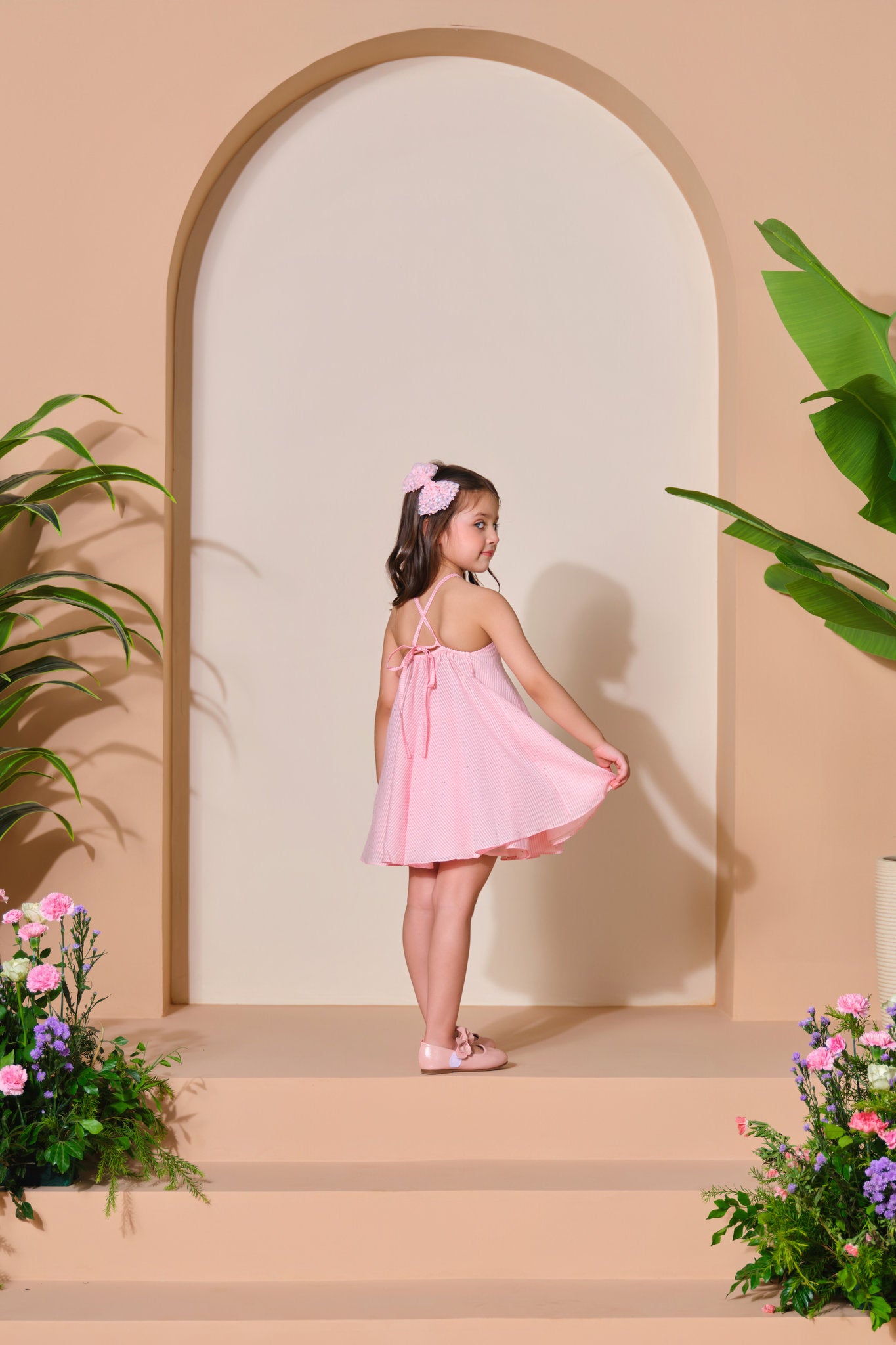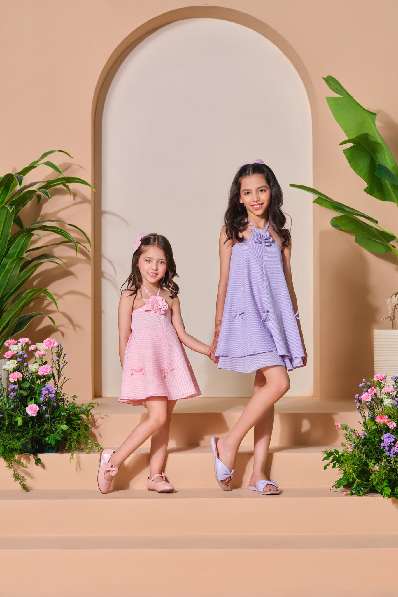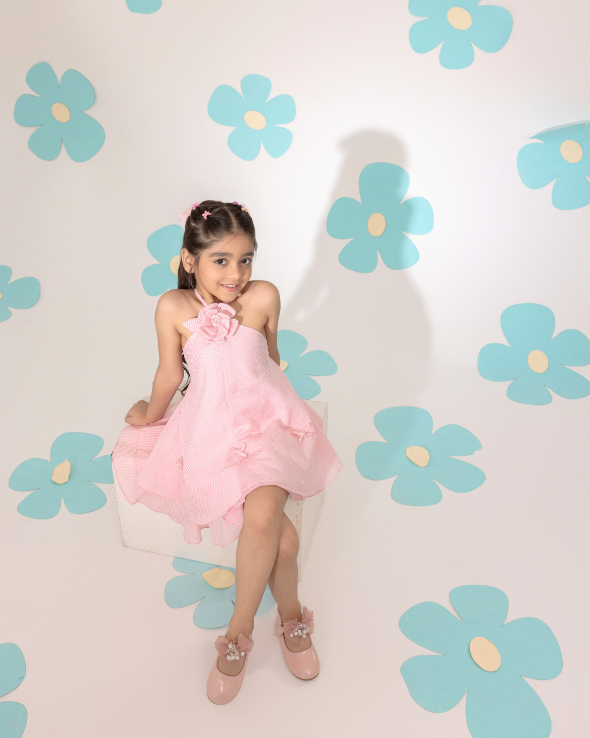 A 2 pc set includes layered pink halter neck dress with a frilly shorts comes with pocket details is a delightful addition to any little girl's wardrobe, crafted from striped fabric. Its big rose embellishment on the neck not only enhances its femininity but also ensures comfort, making it ideal for warm weather and special occasions. This versatile piece is perfect for birthday parties, family gatherings, or casual outings, with its eye-catching pink color and delicate bow details adding a soft, classy touch that stands out beautifully in any occasion.