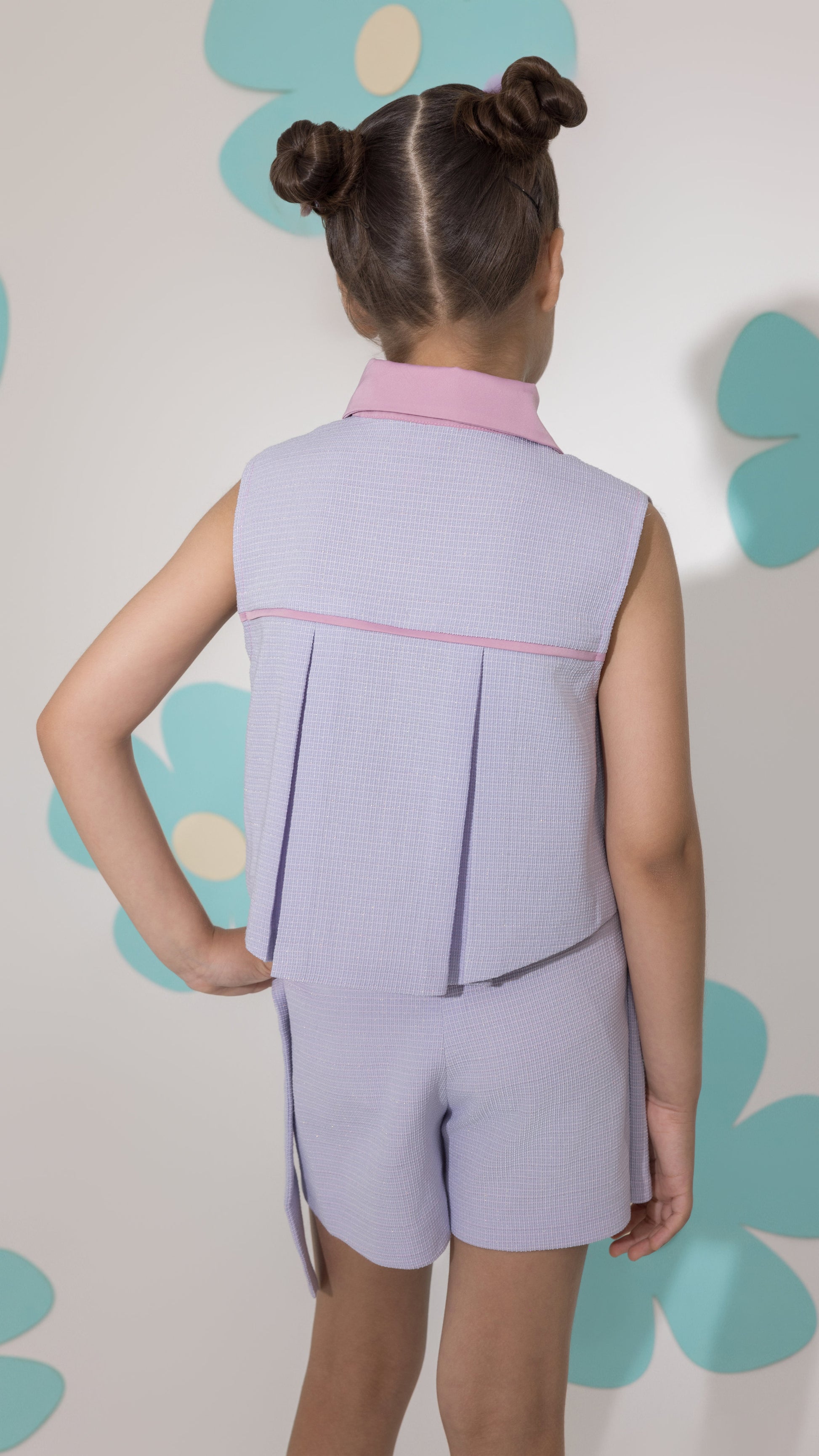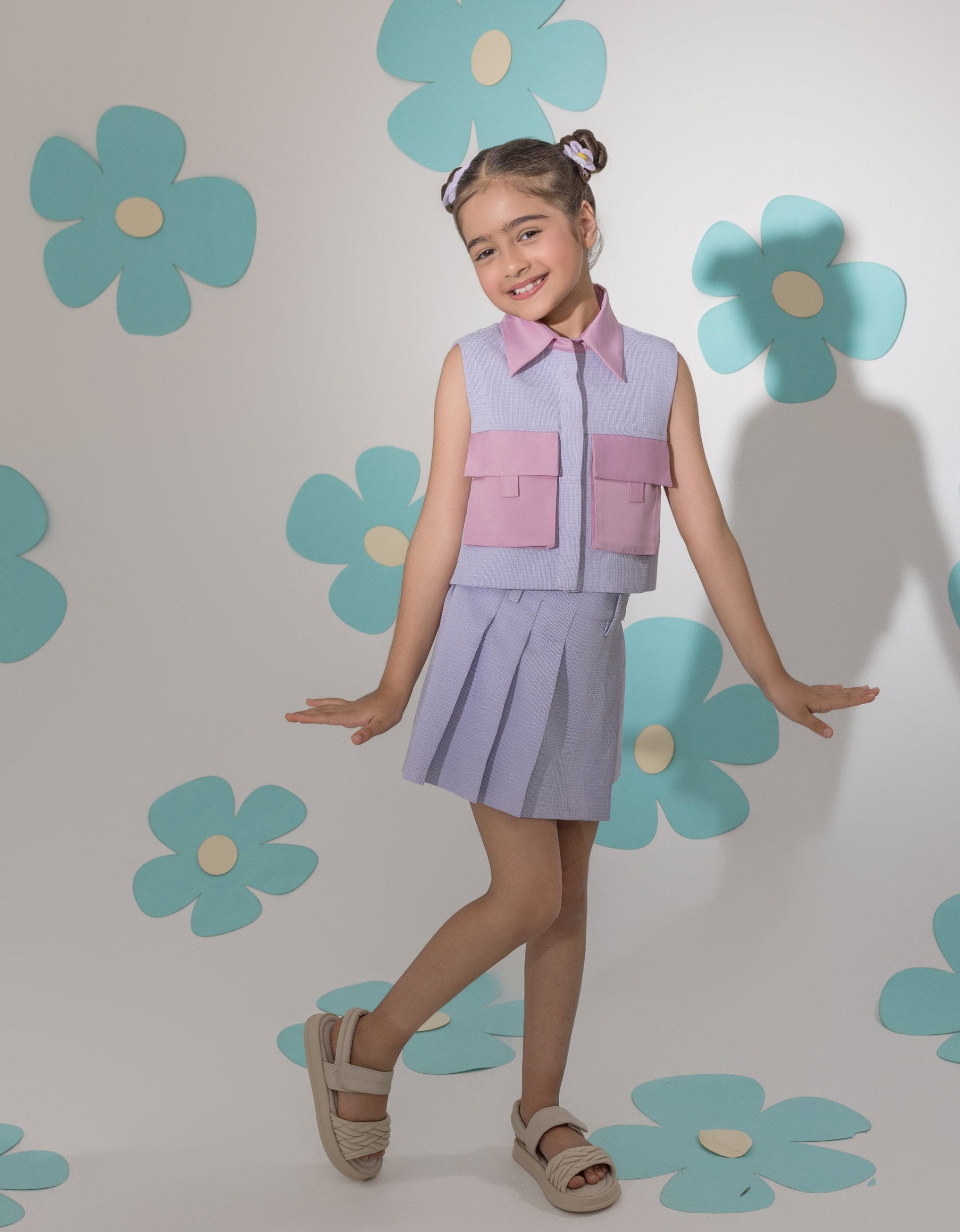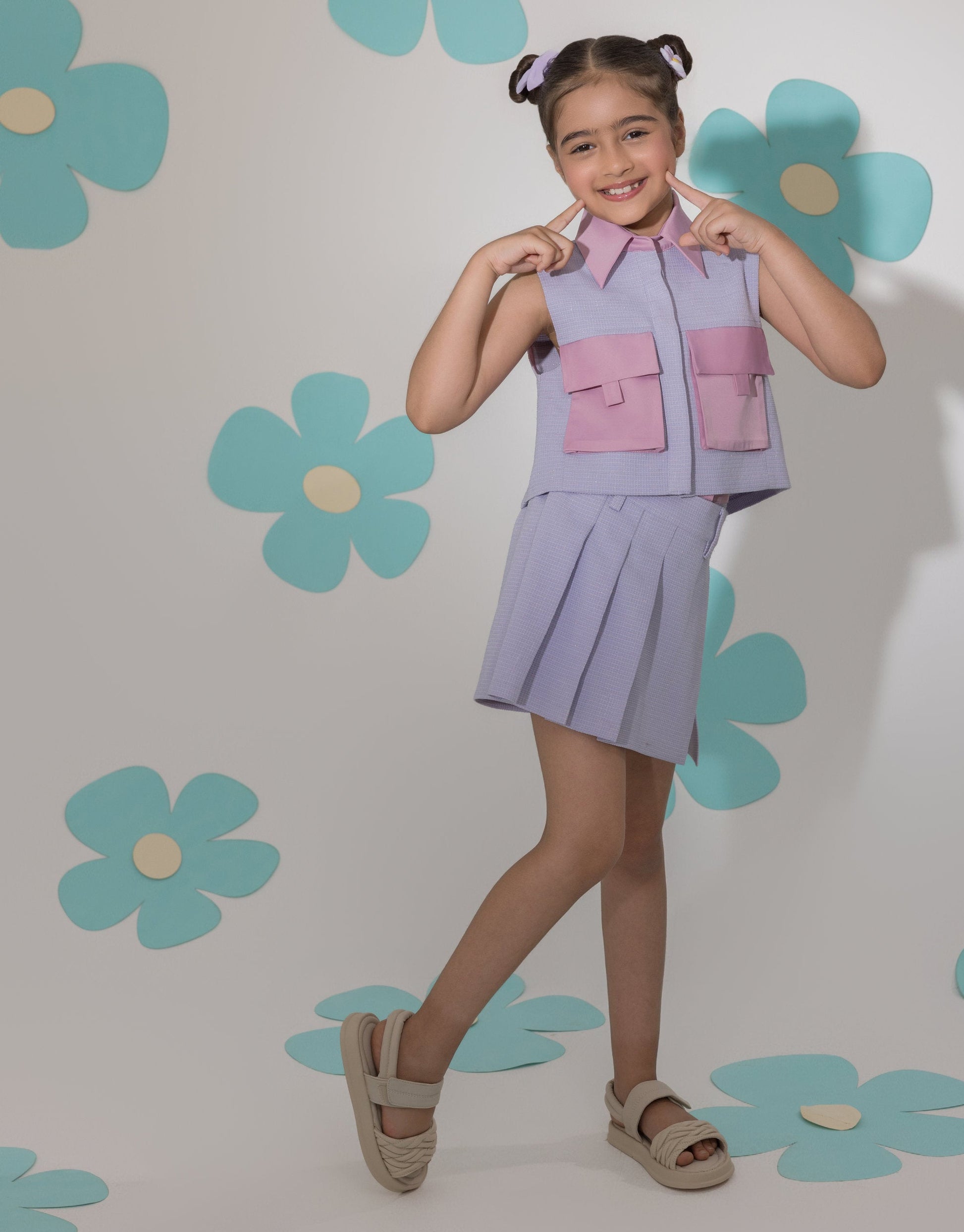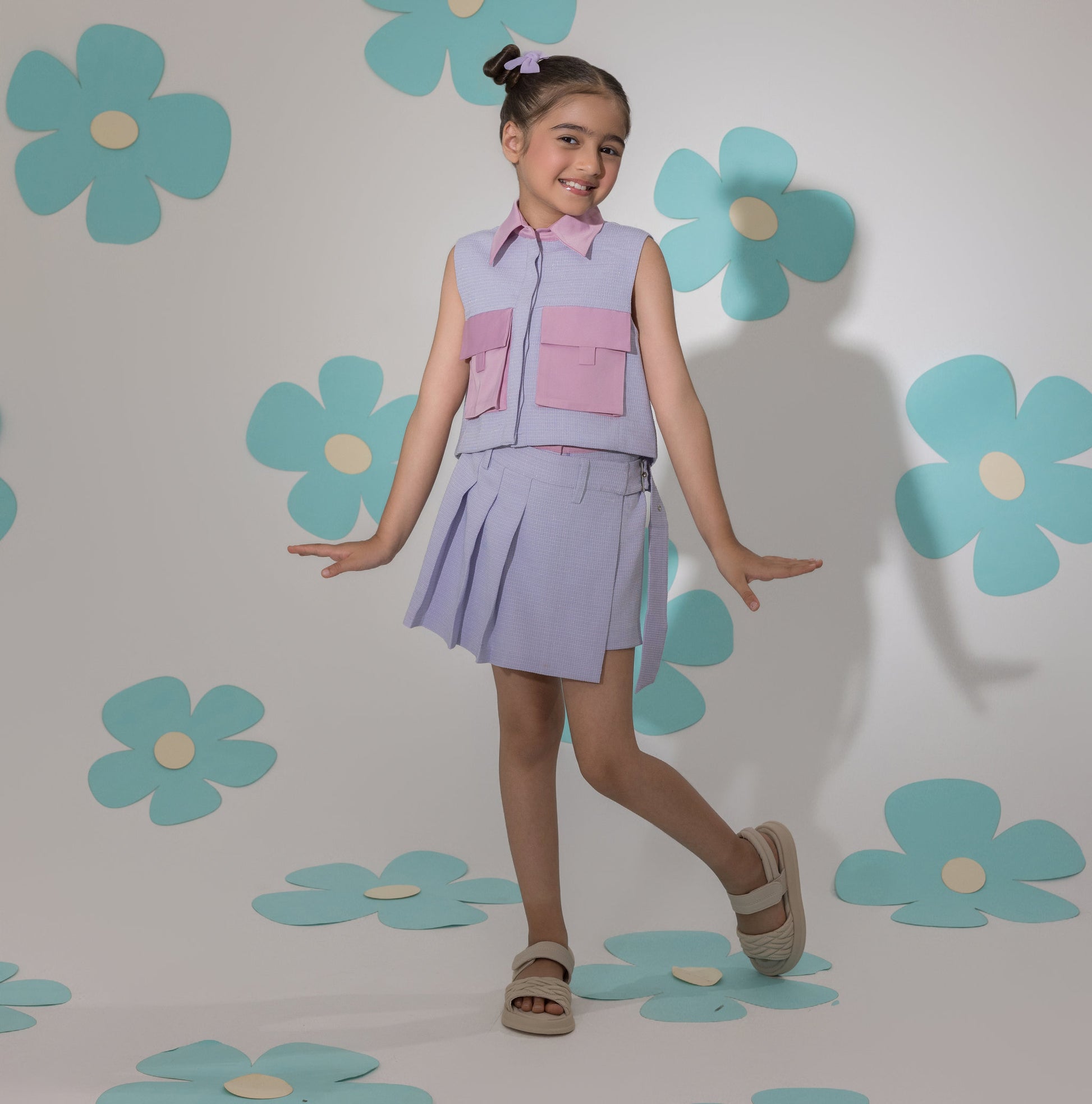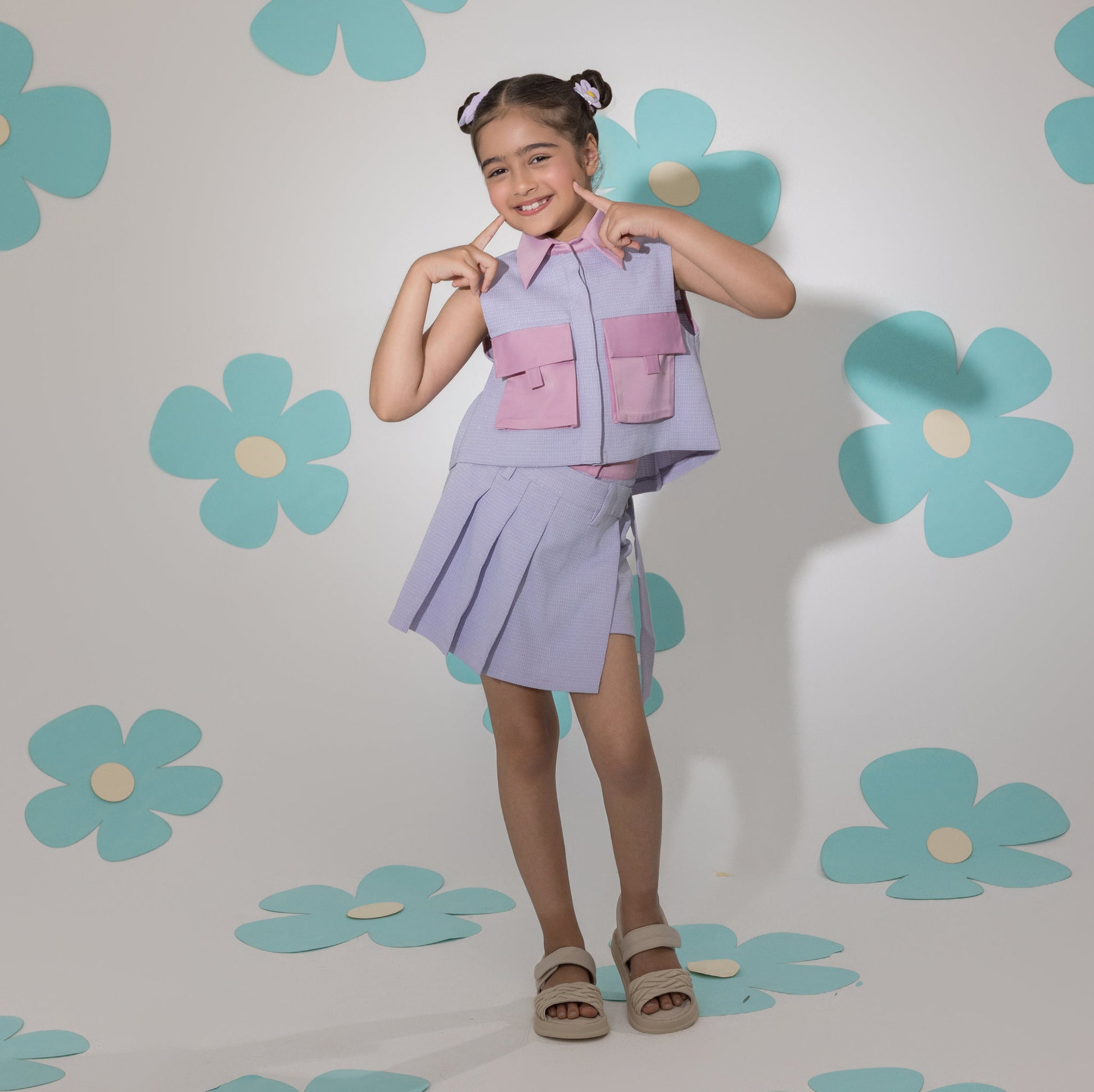 This whimsical co-ord set ensemble, featuring delicate pleated skorts with side belt detailing is ideal for a day filled with excitement and fashionable ease.