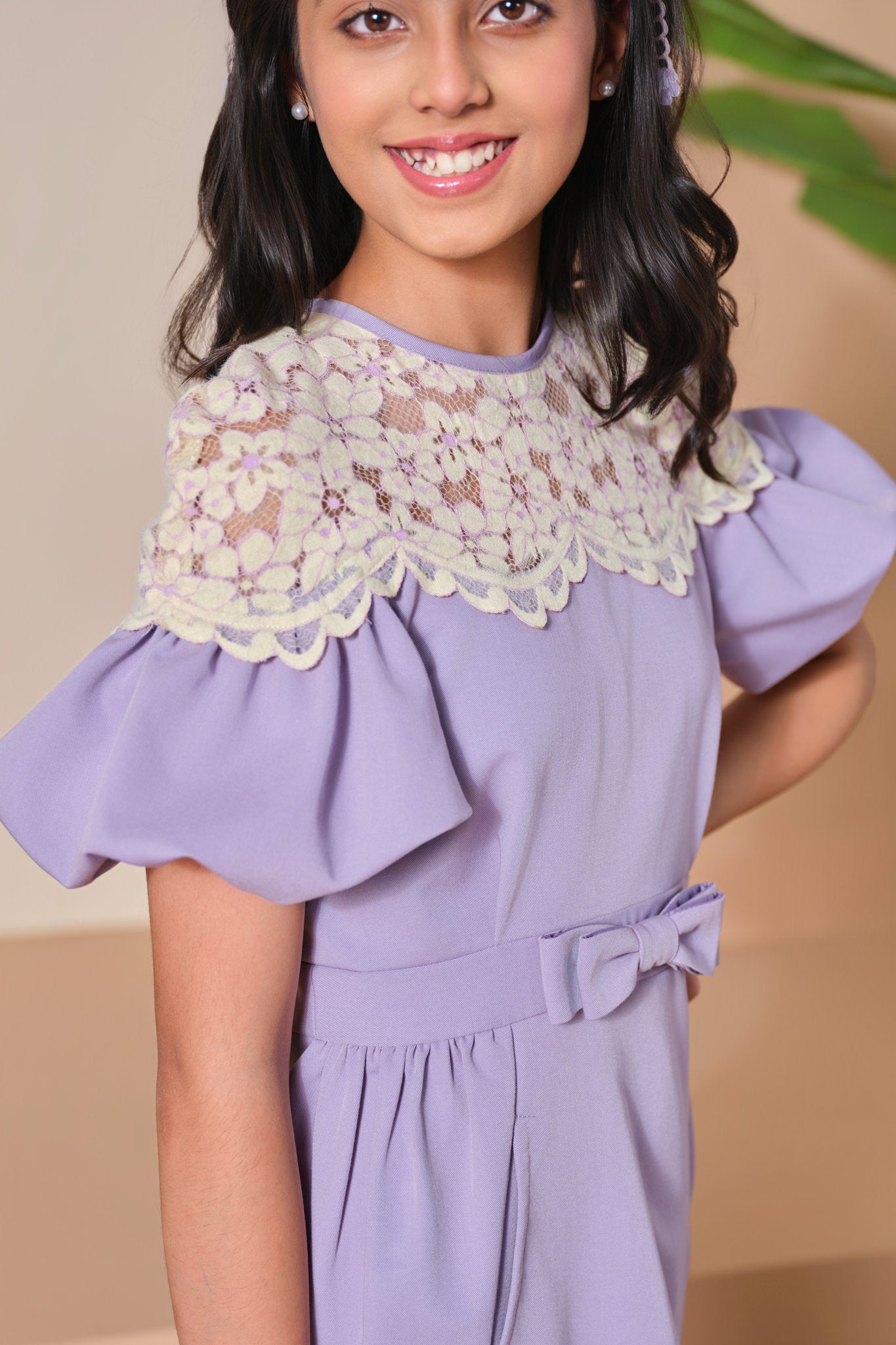 From our Whimsical Bloom collection, this enchanting duo marries Lavender , with ethereal White Chantilly Lace. The cropped top features a crisp collar and full lace puff sleeves, finished with a scalloped lace hem. The A‑line skirt echoes the lace in bold overlays and playful patch pockets. Nostalgic yet modern—ideal for chic garden soirées and sophisticated daytime rendezvous.